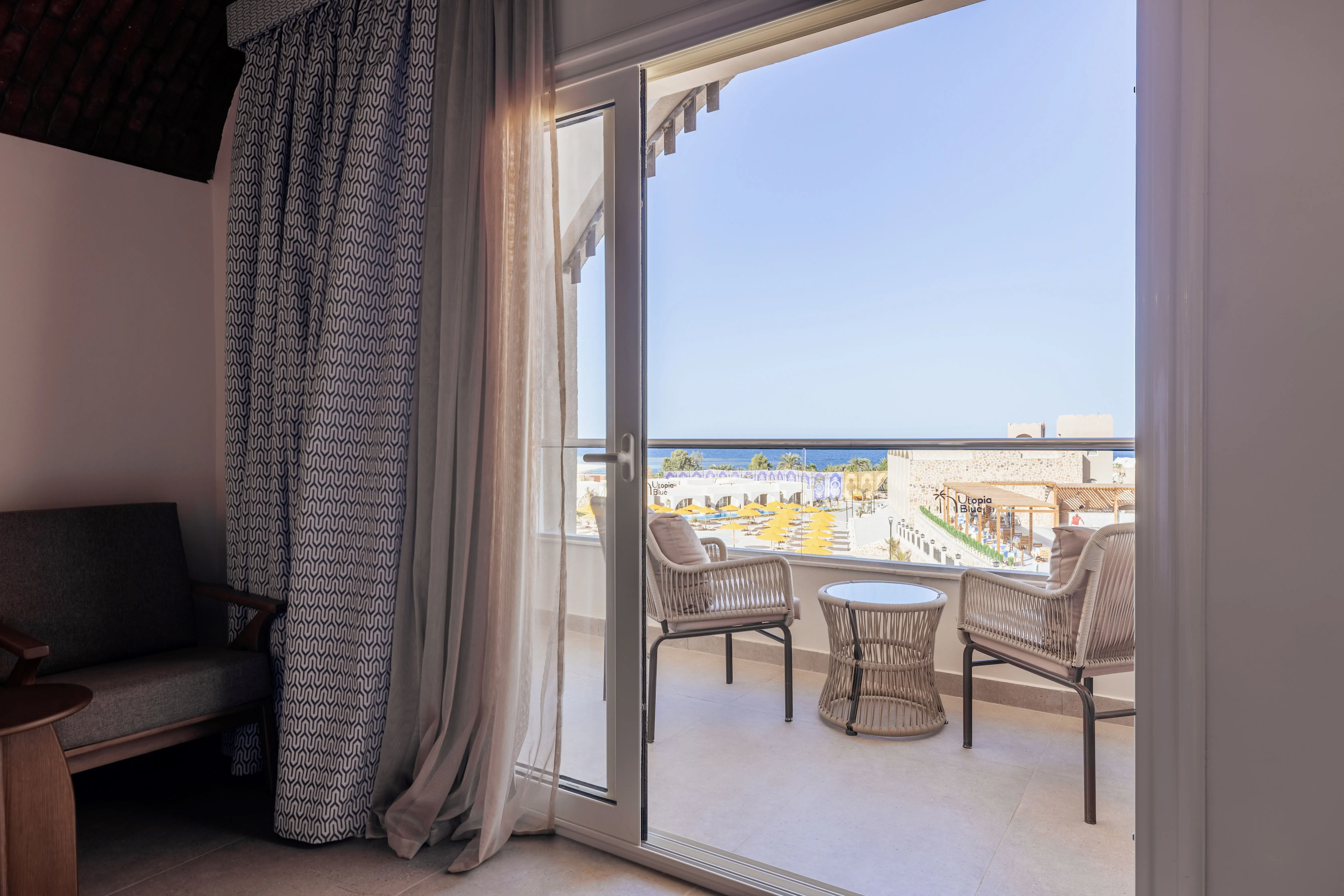 Utopia Blue Resort znajduje się około 300 metrów od piaszczystej plaży, gdzie Goście mogą korzystać z bezpłatnych parasoli i leżaków plażowych, zapewniających komfortowy wypoczynek nad morzem.