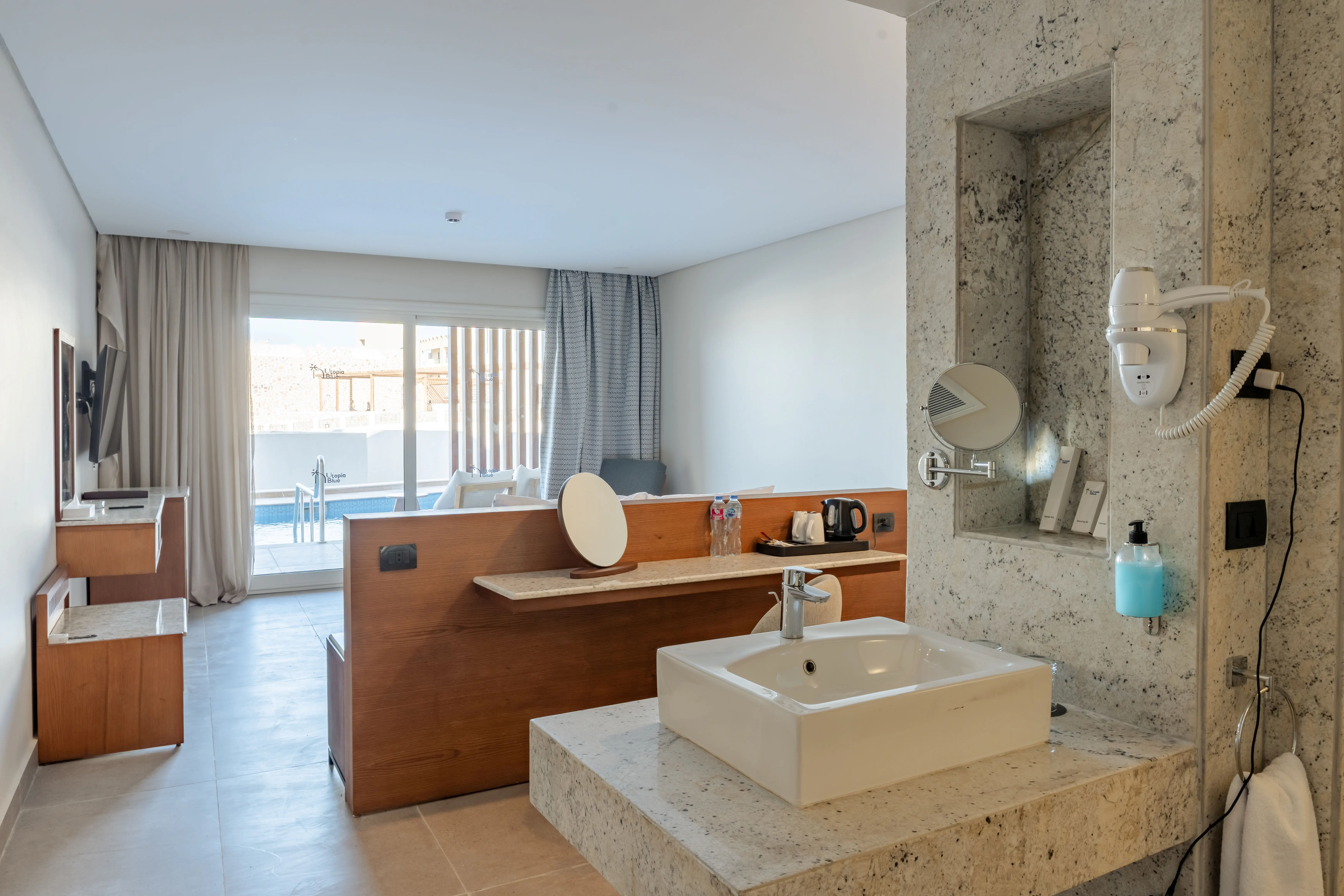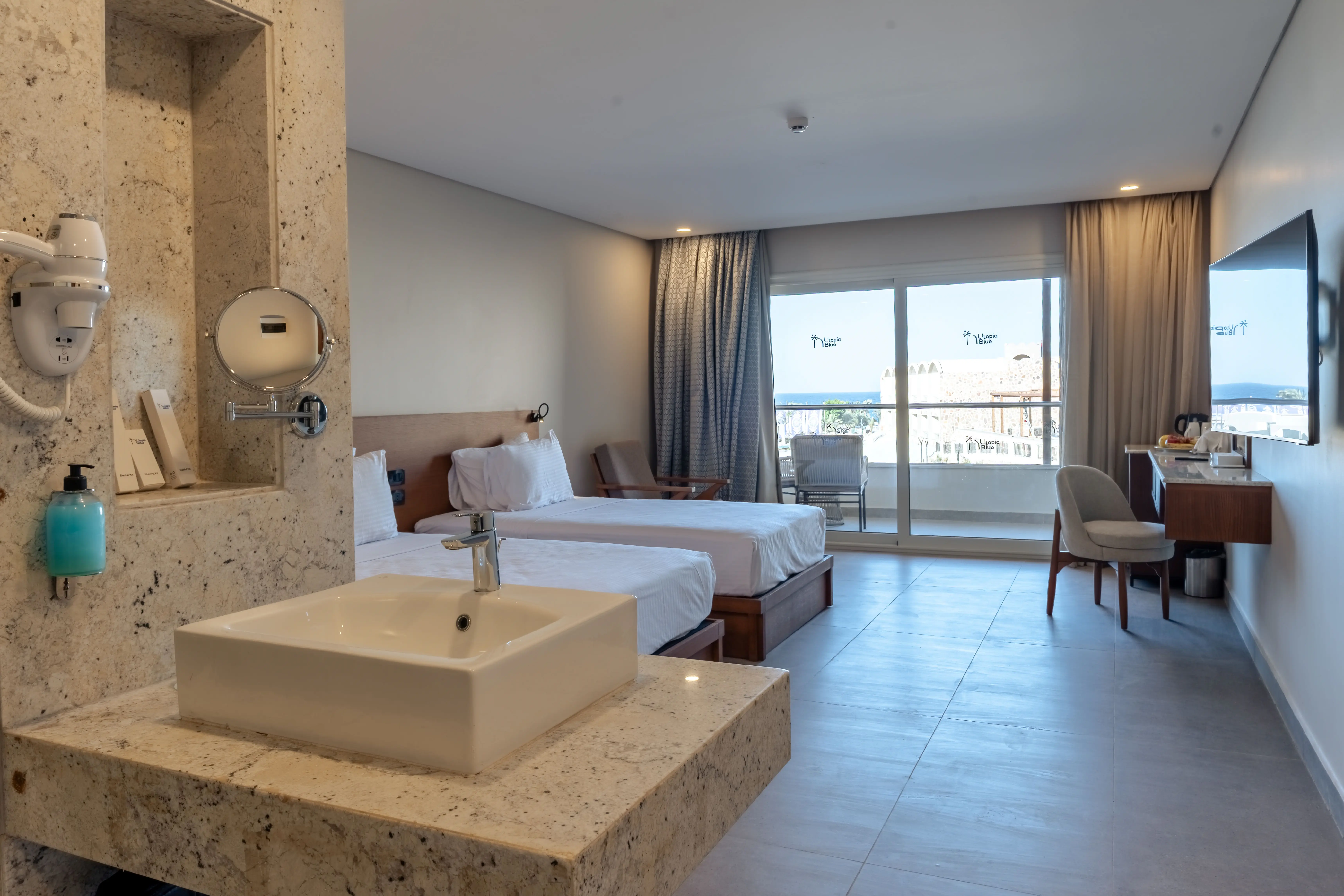 Utopia Blue Resort to luksusowy, pięciogwiazdkowy hotel, oferujący wszystko niezbędne do komfortowego wypoczynku. Zlokalizowany w malowniczej okolicy, zapewnia łatwy dostęp do pięknej, piaszczystej plaży, oddalonej zaledwie 300 metrów od obiektu. Hotel oferuje zakwaterowanie w eleganckich pokojach oraz różnorodne opcje gastronomiczne, w tym restaurację główną i Fayroz Beach Restaurant, a także cztery restauracje a la carte na terenie siostrzanego hotelu Utopia Beach Club. Liczne bary, w tym bar w lobby i bar przy basenie, uzupełniają szeroką ofertę wyżywieniową. Goście mogą cieszyć się programem all inclusive, obejmującym posiłki oraz wybrane napoje. Udogodnienia takie jak sklepy z pamiątkami dostępne są na miejscu, co czyni ten obiekt idealnym miejscem do relaksującego wypoczynku.