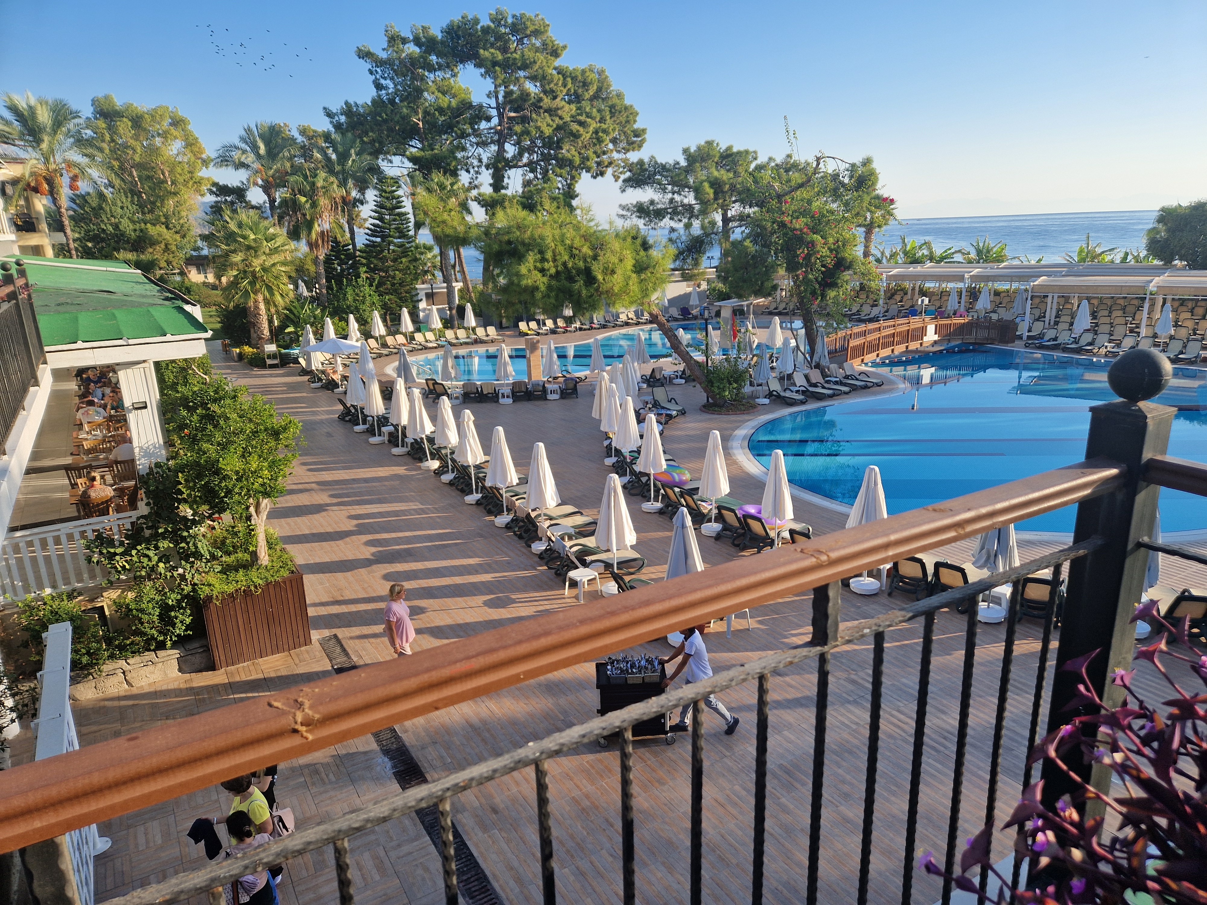 Hotel jest spory. Dużą zaletą jest kilka basenów i bliskość plaży. Plaża kamienisto-żwirkowa, więc warto mieć ze sobą buty, niestety jest wąska, leżaki są w bliskiej odległości od morza. Z leżakami przy basenach czy przy morzu nie było problemu, praktycznie o każdej porze można było znaleźć wolne leżaki 🙂 jedzenie ok, duży wybór - śniadania i obiady zazwyczaj podobne dania, kolacje były różnorodne. Spory wybór rybek, jeśli ktoś lubi. Pokoje na pewno nie zasługują na miano 5*, brzydki zapach wilgoci i nieoczyszczonej klimy. Pościel nie była zmieniana codziennie, ręczniki tak.