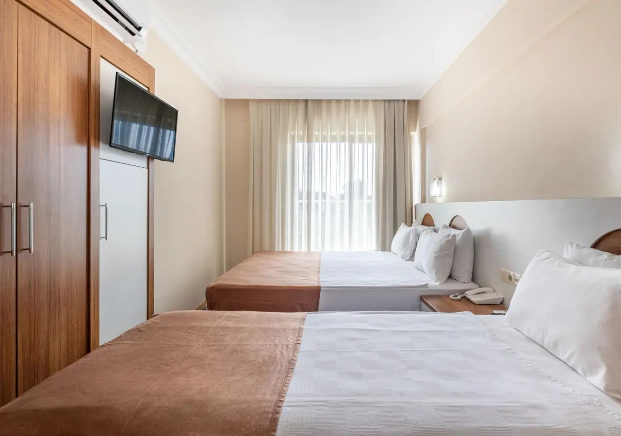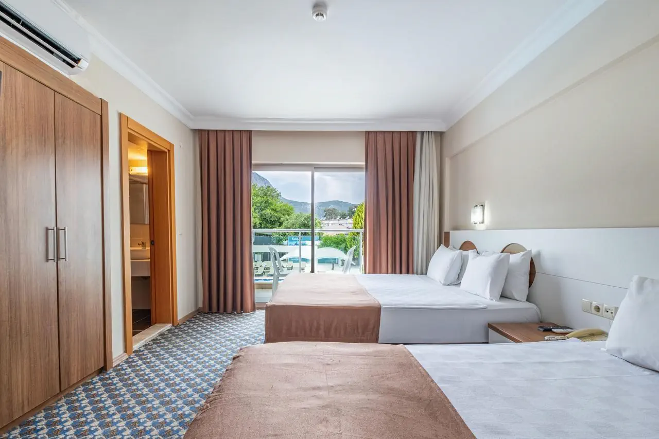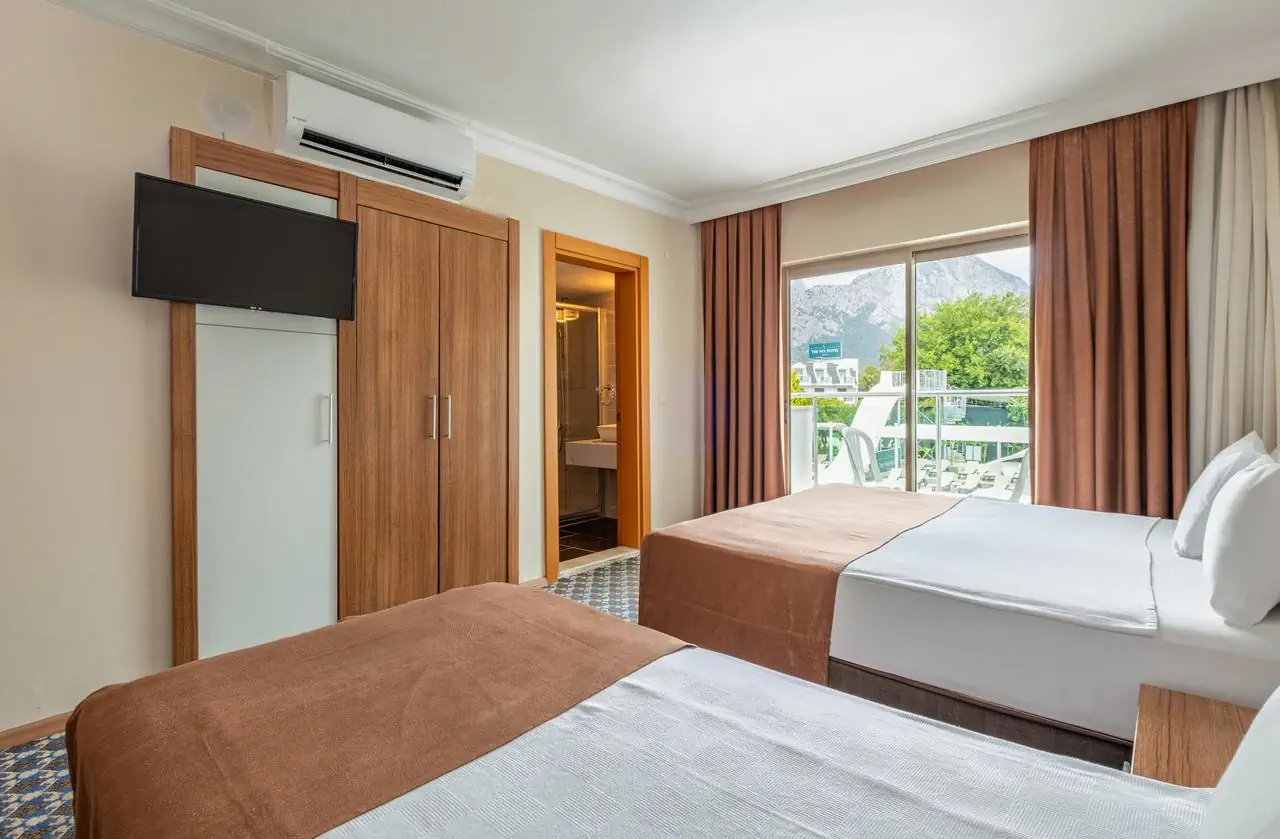 standardowy - 2-os. (możliwość 1 dostawki), ok. 25 m2, nowoczesny, indywidualnie sterowana klimatyzacja, łazienka (prysznic, wc; suszarka), telewizja satelitarna, telefon; za opłatą - sejf (ok. 3 EUR/doba), mini-bar (bezpłatnie woda mineralna na powitanie); bezpłatne łóżeczko dla dziecka do 2 lat na zamówienie przed przyjazdem; balkon (stolik i krzesełka), widok na ogród lub góry; - rodzinny - 2-os. (możliwość 1 lub 2 dostawek), ok. 35 m2; wyposażenie jak w pokoju standardowym.